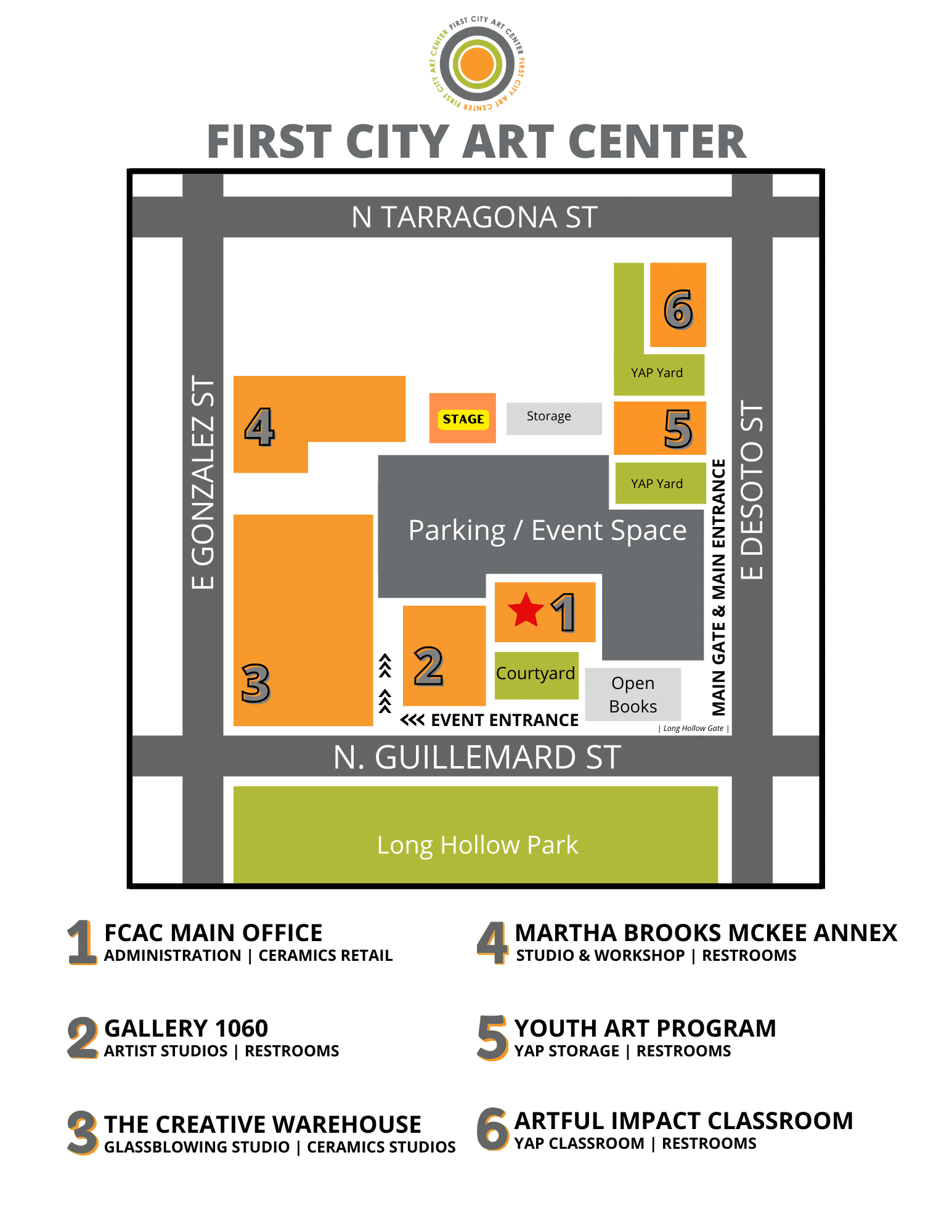 When you arrive at the western edge of our campus at 1060 N. Guillemard St. in Pensacola, Florida, there is street parking on N. Guillemard St. and a pedestrian entrance (“Event Entrance” on the map below, between buildings #2 and #3), distinguished by a brightly colored mural and rainbow walkway. Around the corner on the southern side of the campus on De Soto Street, there is a vehicle entrance and parking lot. If the pedestrian entrance is not open when you arrive, please use the De Soto Street entrance. As you drive into the De Soto St. entrance, our main office is located in building #1 directly in front of you, just before the Gallery 1060 Building #2. Open Books, one of our non-profit partners, is located in the building to the left of FCAC’s Main Office, facing Guillemard St.